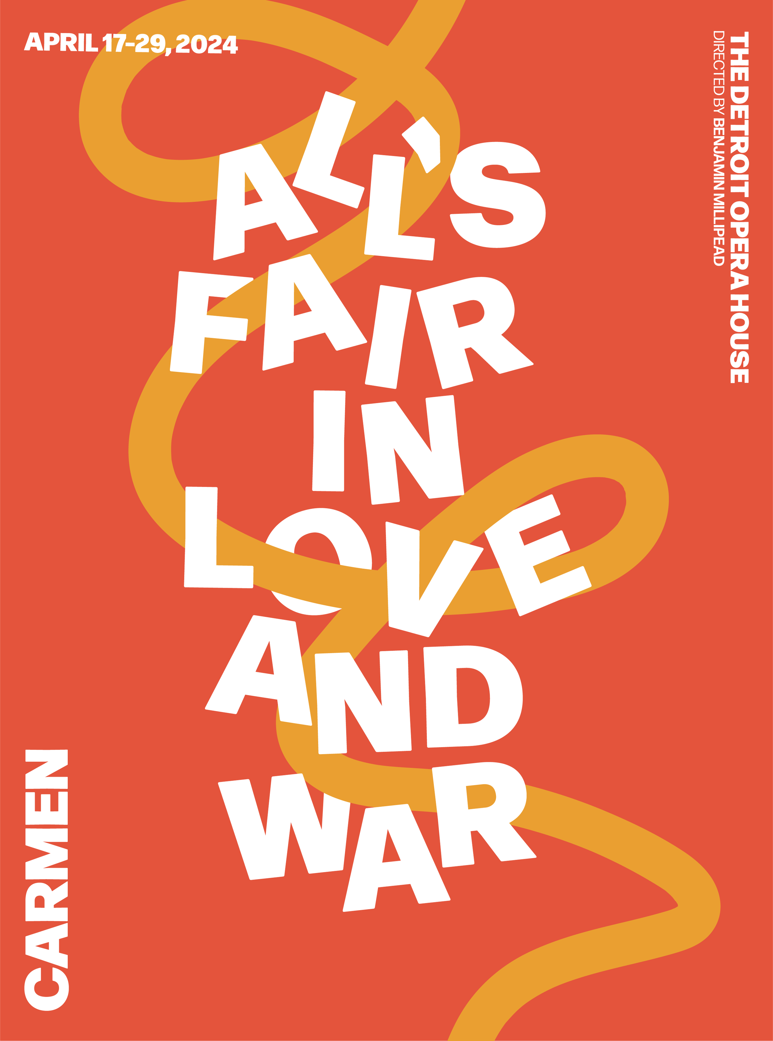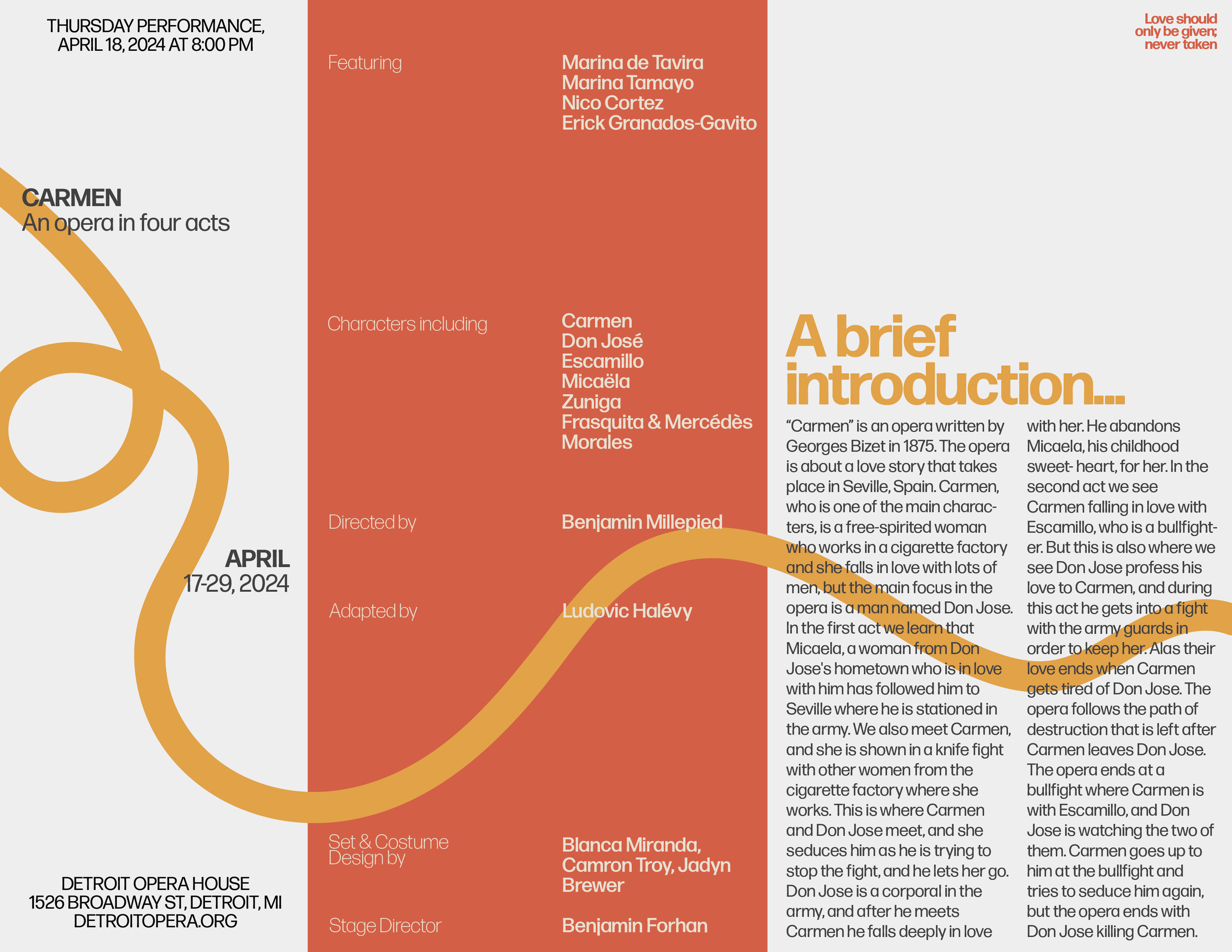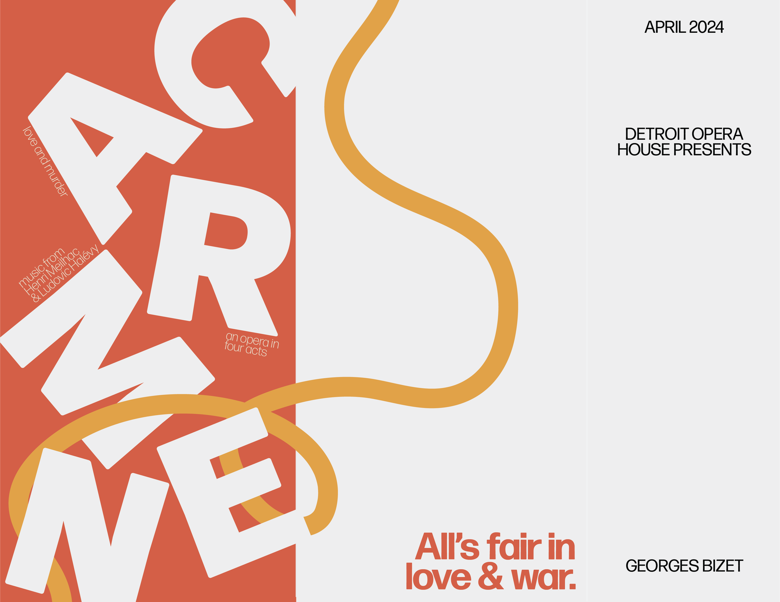 For this project in Experimental Typography, I was tasked with creating a poster and program for the Detroit Opera House’s performance of Carmen. First performed in 1875, Carmen is one of the world’s most famous operas, a story of love, obsession, and tragedy set against the vibrant backdrop of Seville, Spain.